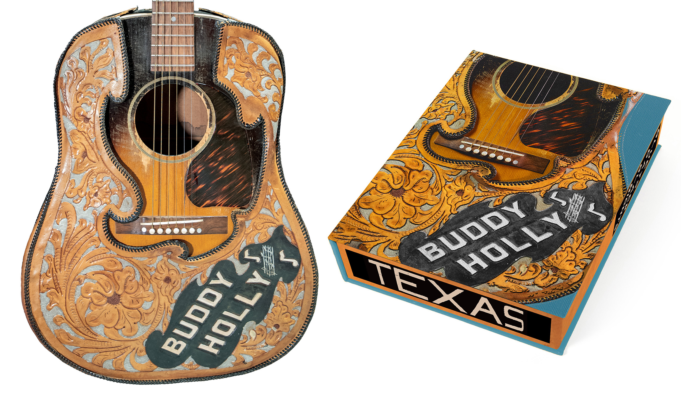 See above for a performance of Buddy Holly's iconic 'Peggy Sue' by Alister Atkin and Pete Allen. Alister and Pete created nine custom leather-tooled guitars and book covers for the Words of Love Luthier Edition (now fully subscribed). The guitars are exact, handcrafted replicas of Buddy's own customised J-45.